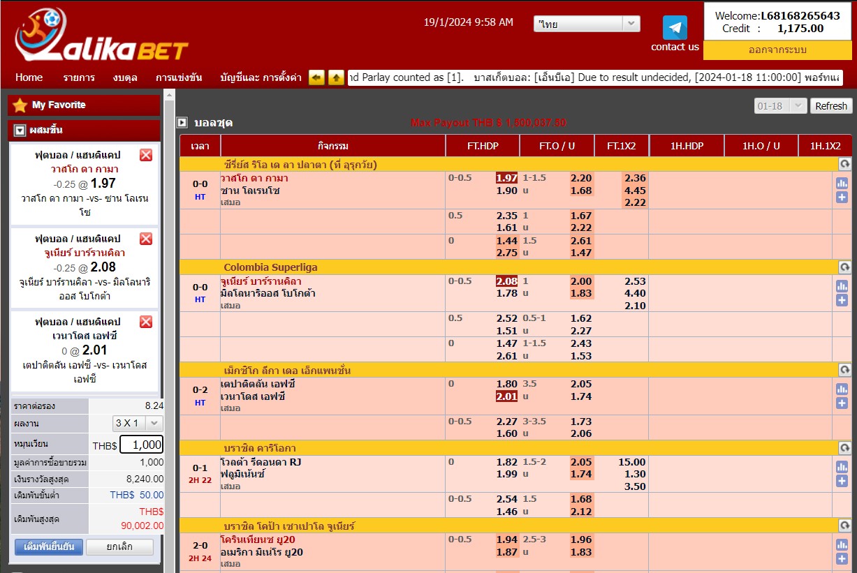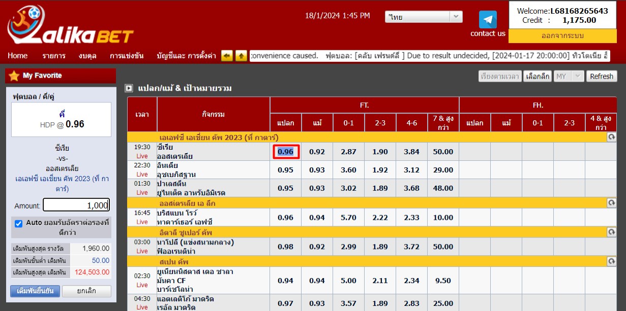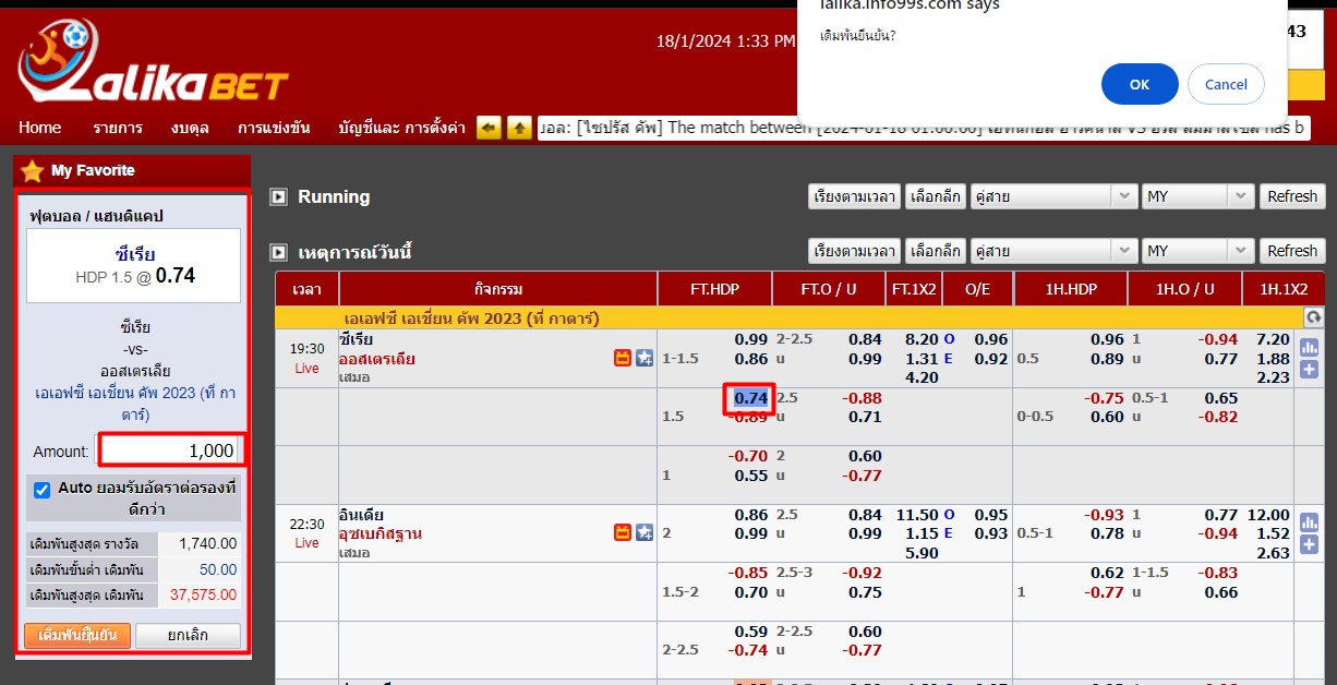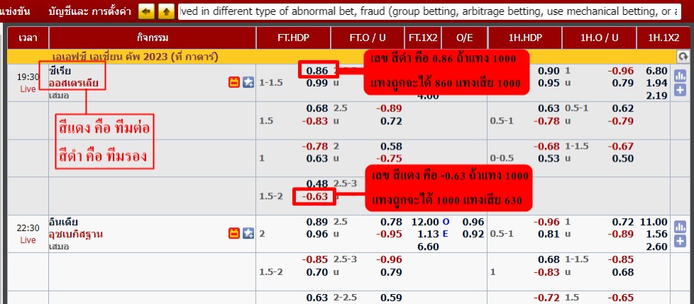 ” ตัวอย่างเช่น กดแทงเจ้าบ้าน ซีเรีย ราคาต่อรอง 1.5 (ลูกครึ่ง) ราคา 0.74 แล้วเลือกใส่จำนวนเงินที่เราจะแทงที่ช่องทางซ้ายมือ ใส่จำนวนเงินไป 1000 บาทถูกก็จะได้ 740 บาท ถ้ารวมกับเงินที่แทงแล้วจะได้ 1740 บาท ถ้าเสียก็เสียไป 1000 บาท แล้วกดทำรายการจะมีหน้าต่างขึ้นมา ว่า ”เดิมพันยืนยัน?” ให้กด (OK) “