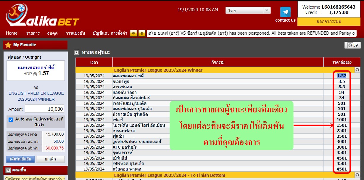 เป็นการทายผลผู้ชนะเพียงทีมเดียวโดยแต่ละทีมจะมีราคาให้เดิมพันตามที่คุณต้องการ